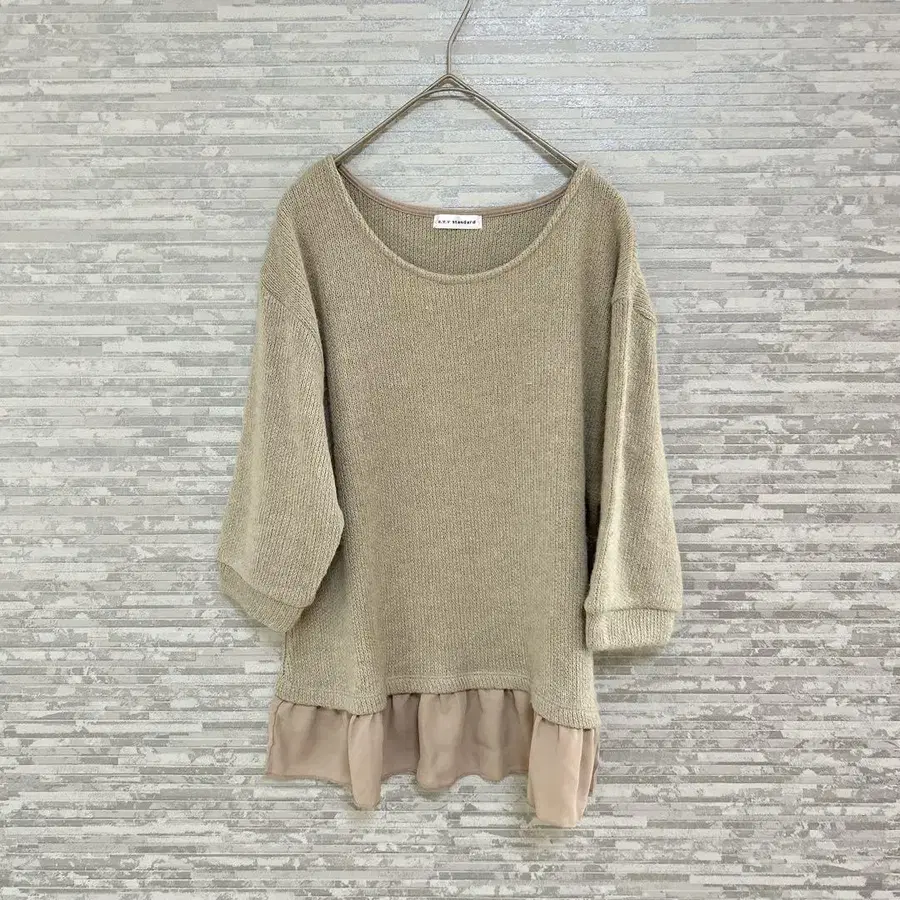 a.v.v standard의 베이지 계열의 부드러운 니트에, 밑단의 쉬폰 프릴을 도킹한 레이어드 스타일 디자인.