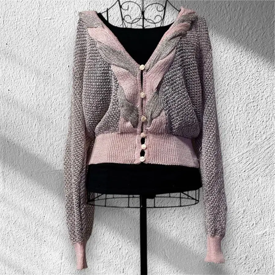 [ 자카드 니트 가디건 핑크 골드 버튼 라메 믹스 올 패턴 구제 의류 ]