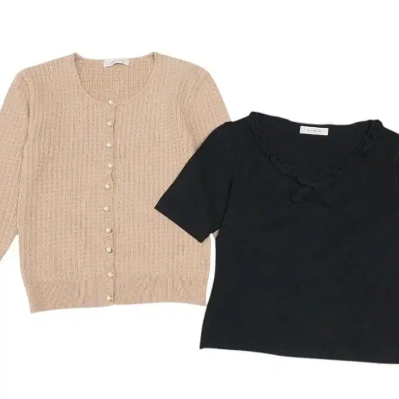 펄 단추가 화려한 케이블 니트 가디건과, 리본이 포인트가 된 부드러운 질감의 레이온 니트 탑 2점 세트입니다.