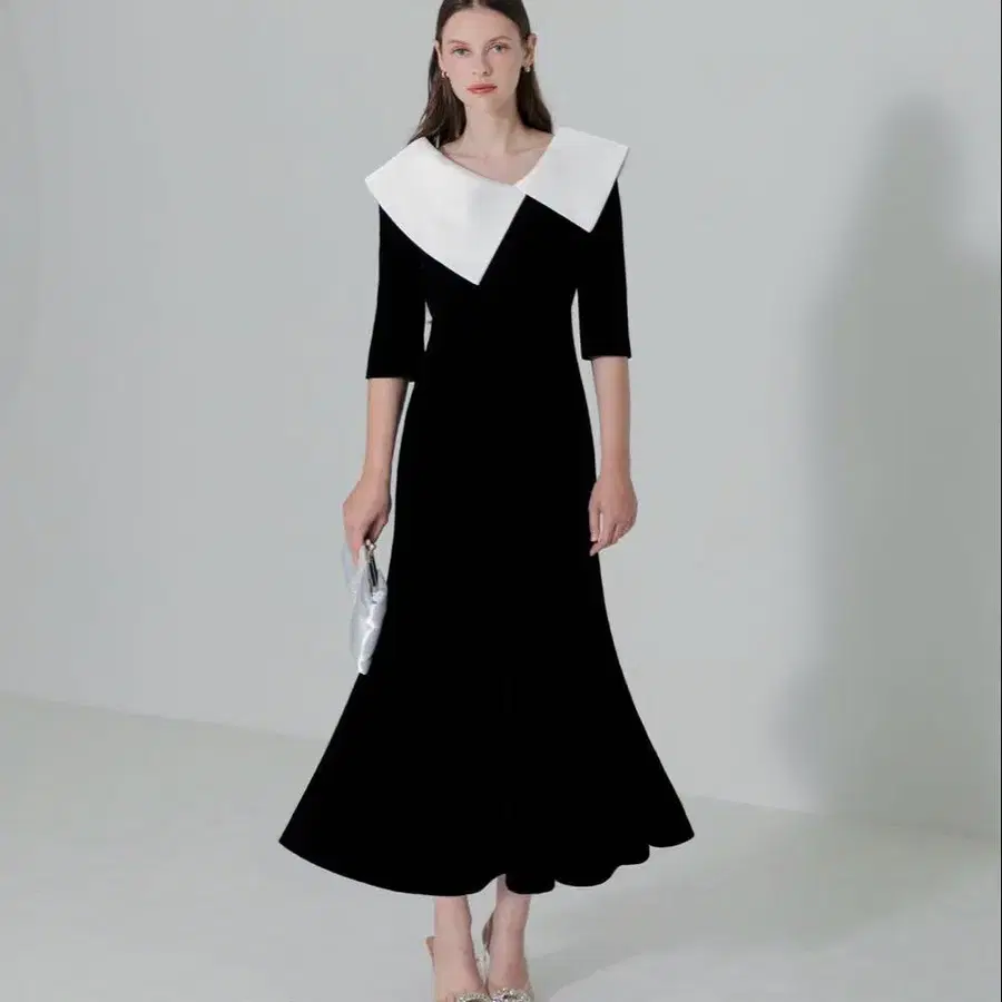 [ LEJA ] 배색 비대칭 빅 칼라 벨로아 머메이드 실루엣 드레스