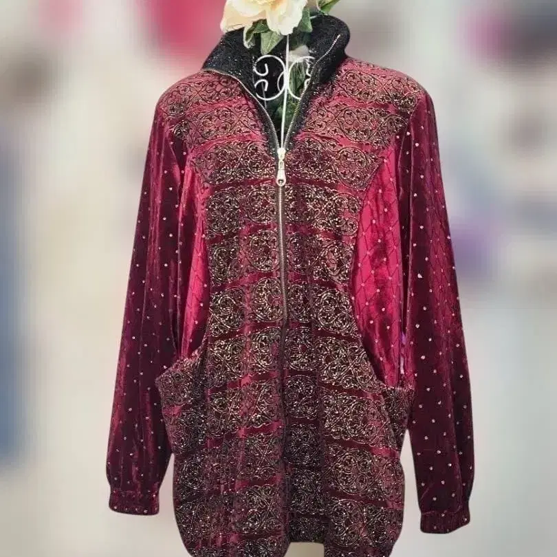 깊이 있는 보르도 색상에, 고급스러운 금실 느낌의 자수를 듬뿍 더한 고져스한 벨벳 자켓입니다.