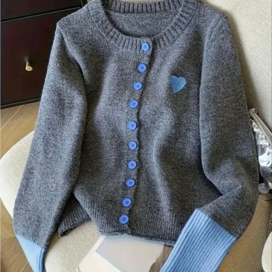 새상품! 그레이와 스카이블루 배색 가디건 하트 원포인트 스카이블루 버튼