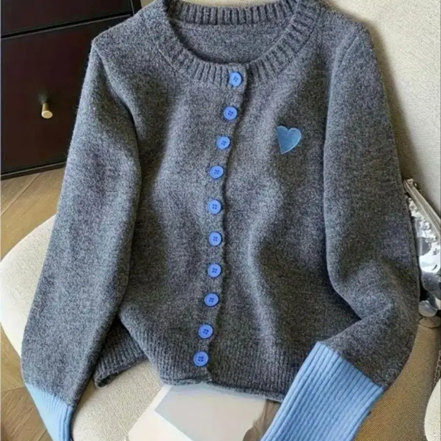 새상품! 그레이와 스카이블루 배색 가디건 하트 원포인트 스카이블루 버튼