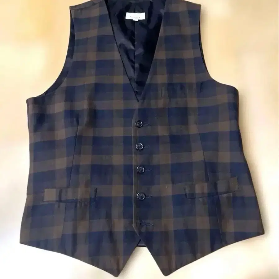 자동 번역되었어요. 원문보기브라운과 네이비 체크 무늬의 슬리브리스 베스트, 사이즈 46.