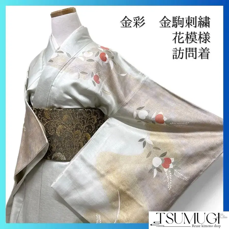 격자 지문에 옅은 연두색 바탕에 금駒 자수로 국화, 귤, 등나무, 萩이 그려진 화려한 디자인의 옷입니다.