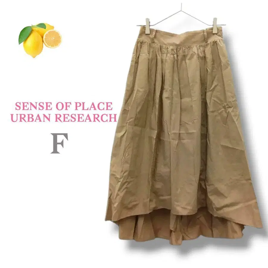 베이지 색상의 플레어 롱 스커트, 엘레강트한 디자인.