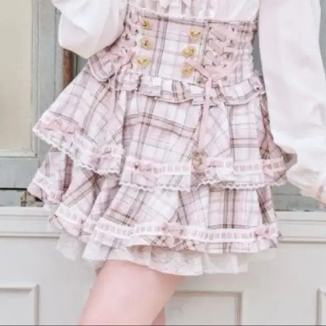 LIZLISA 사다리 리본 체크 티어드 치마바지 핑크