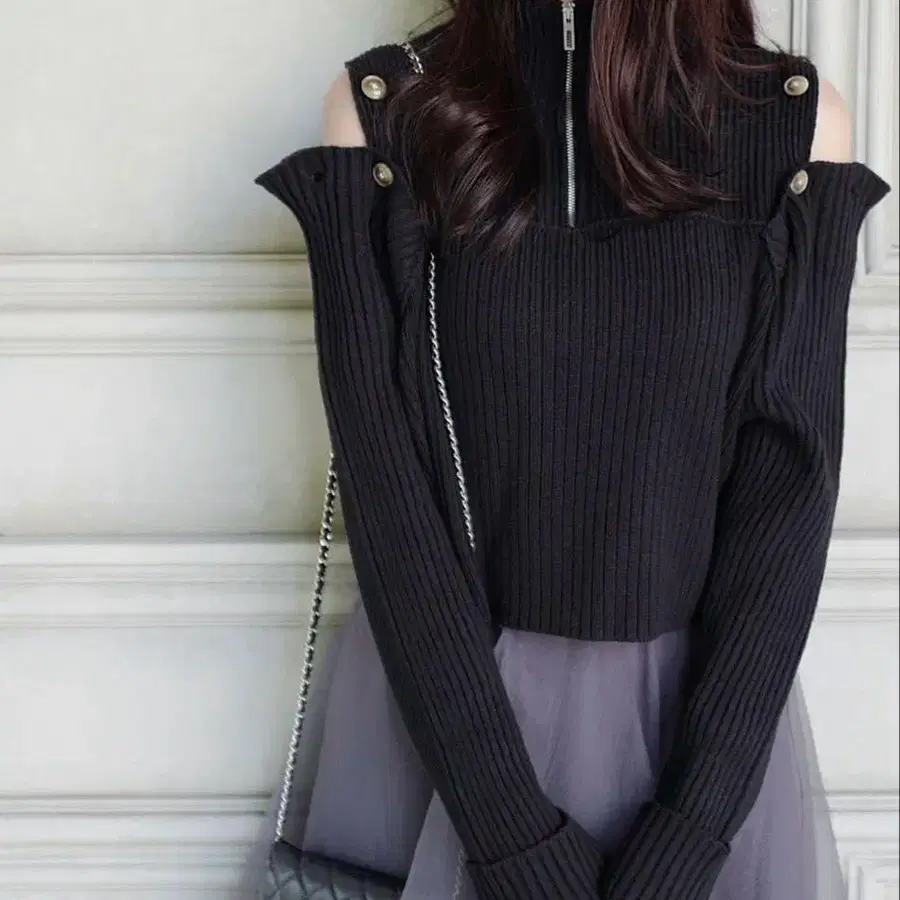 어깨 슬릿 2WAY 버튼 활용 하프 지퍼 리브 니트