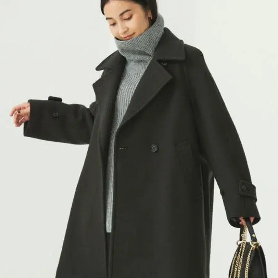 약간 빅 사이즈 실루엣으로 밑단으로 갈수록 살짝 퍼져 보이는 디자인. 어른스러운 릴랙스감이 있는 분위기로 착용 가능한 더블 앞 하프 코트입니다. 옷깃의 탭을 잠가서 착용해도 좋습니다. 자연스러운 분위기, 전체 안감 처리.