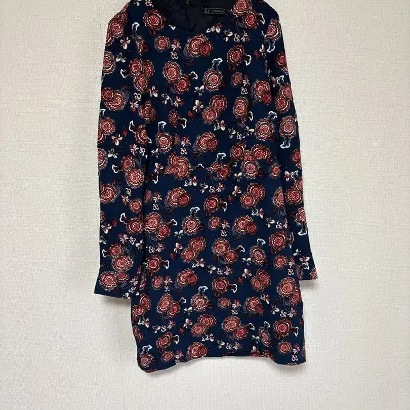 ZARA의 네이비 베이스에 꽃무늬 디자인의 긴팔 미니 원피스입니다. 골드 버튼과 등 부분이 디자인되어 귀엽습니다.