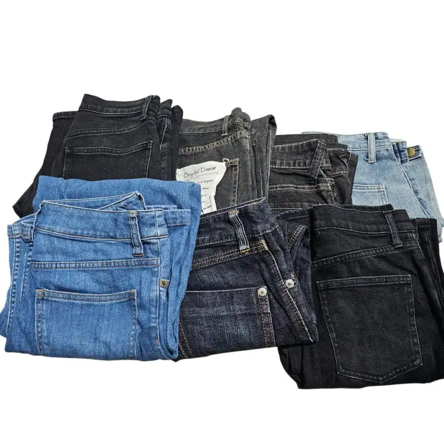 다양한 스타일과 색상의 데님 팬츠 세트 7개