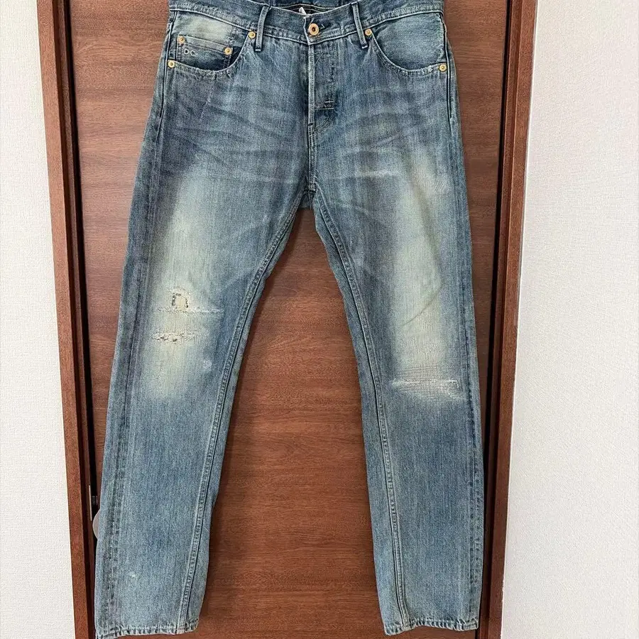 DELUXE 데미지가 특징인 라이트 블루 데님, 스트레이트 스타일. - 색상: 라이트 블루 - 스타일: 스트레이트 - 사이즈: MEDIUM 38 - 데미지: 경미한 데미지 있음 (해짐) 방문해 주셔서 감사합니다. 작게 포장하여 발송합니다.