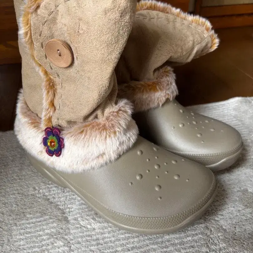 보라색 꽃 모양 지비츠를 부츠와 함께 구매하여 직접 달았습니다. 물론 이것도 새 상품, 미사용품입니다. 괜찮으시다면 이것도 함께 드리겠습니다. 불필요하시면 말씀해주세요.