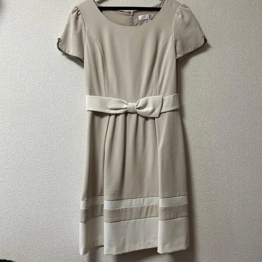 베이지 리본 포함 무릎 기장 원피스 반팔