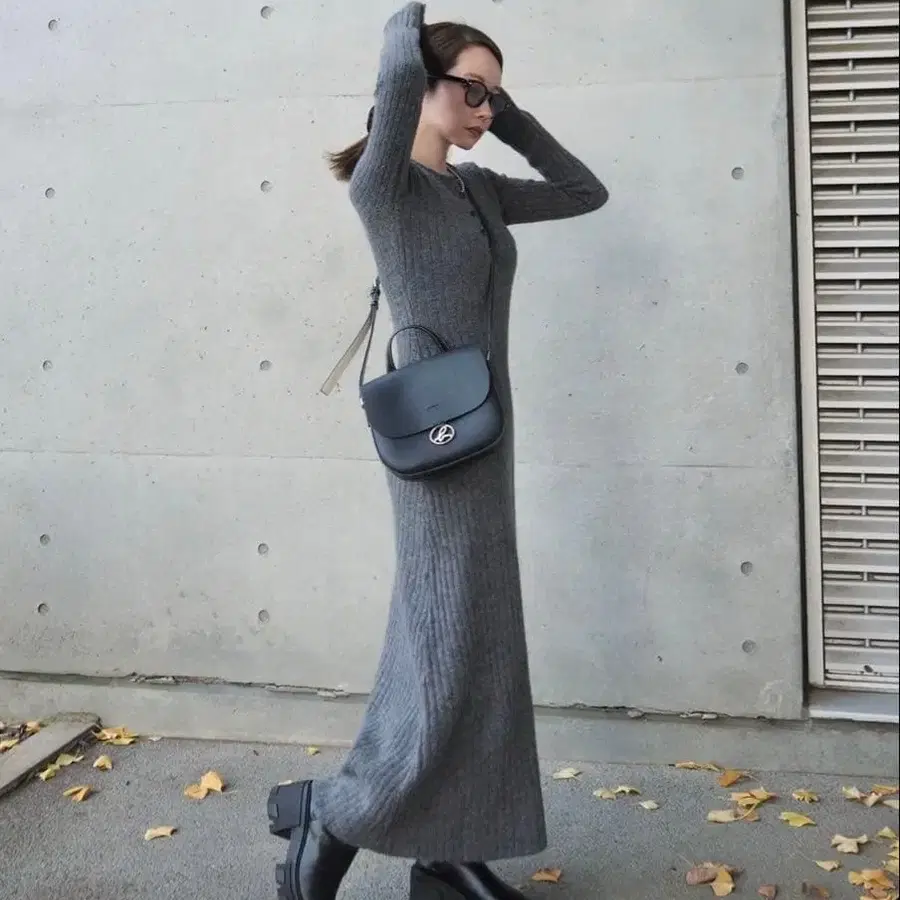 그레이 니트 롱 원피스 긴팔 버튼 포함