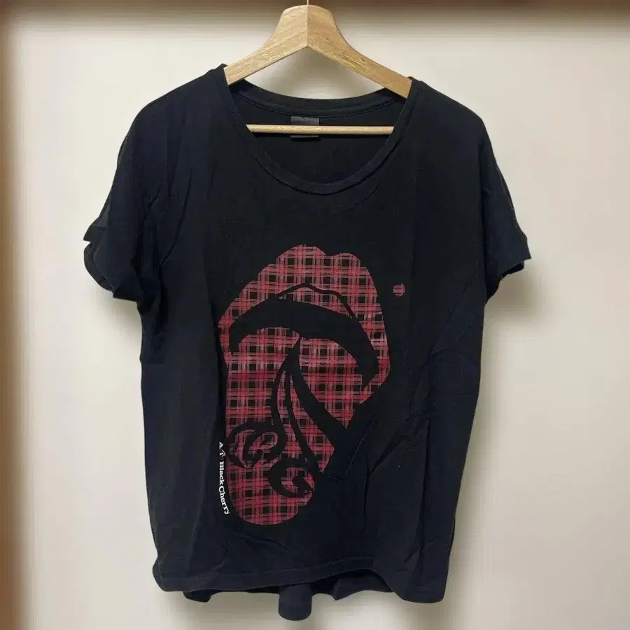 체크 무늬 입 디자인 반팔 티셔츠 블랙