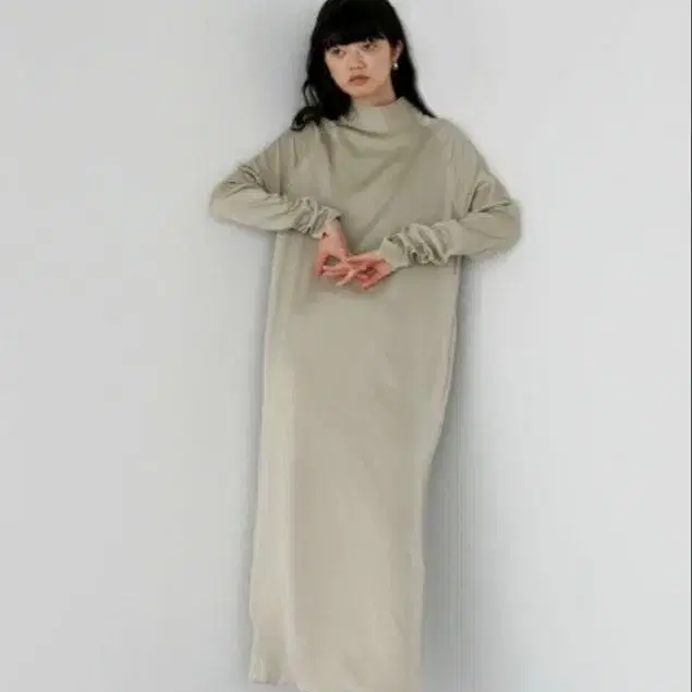 베이지 하이넥 긴팔 롱 원피스