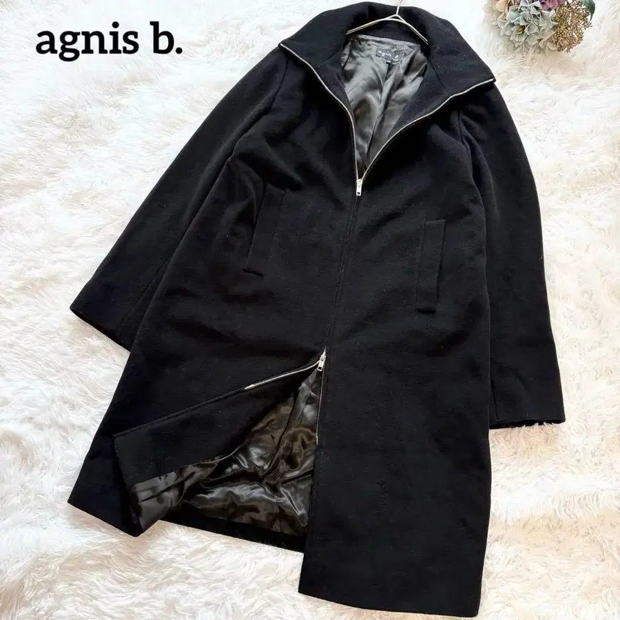 [ 아네스베 ] 울 캐시미어 스탠드 카라 더블 지퍼 롱 코트 블랙
