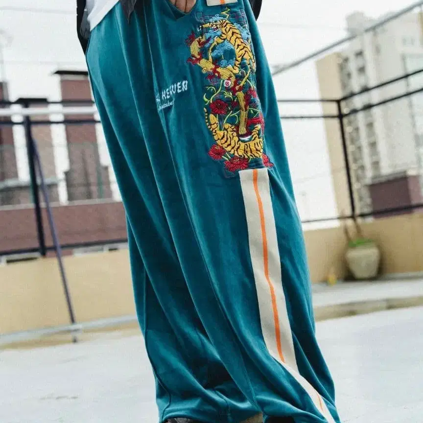 터콰이즈색 자수 조거 팬츠