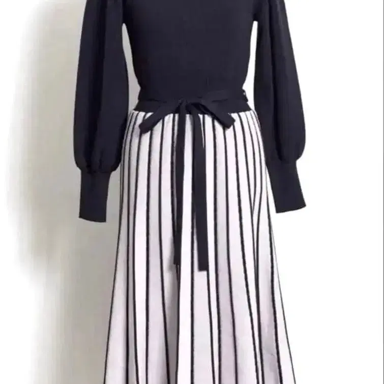 Noela 노엘라 배색 니트 플리츠 롱 원피스 허리 리본 네이비