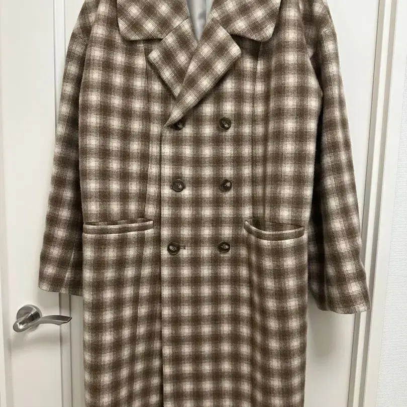 브라운 깅엄 체크 더블 브레스 롱 코트