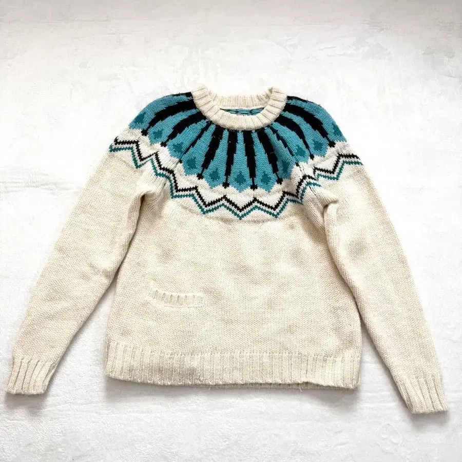 울 100%의 따뜻한 소재감에, 인상적인 노르딕 무늬가 특징인 니트입니다. 아라가키 유이 착용으로 화제가 된 디자인으로 알려져 있으며, 내추럴하고 성숙/러블리한 분위기가 매력인 아이템입니다.