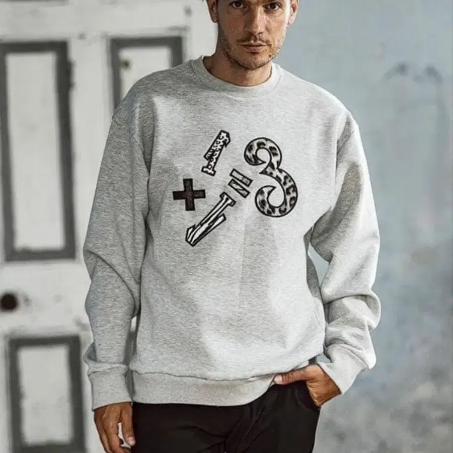 브랜드명의 의미를 담은 [1+1=3]을 배치한 맨투맨 풀오버입니다.