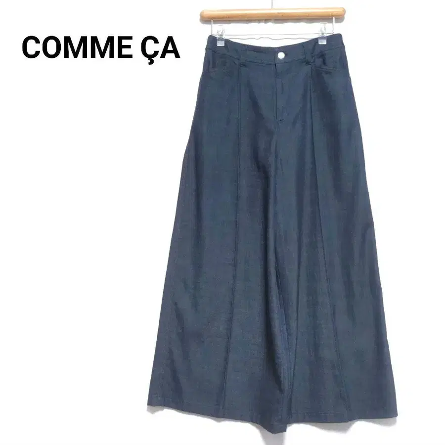 꼼사데모드의 다크 블루, 하이웨스트 와이드 팬츠입니다. 드레이프감 있는 데님 느낌의 원단으로 심플하면서도 스타일리시한 디자인.
