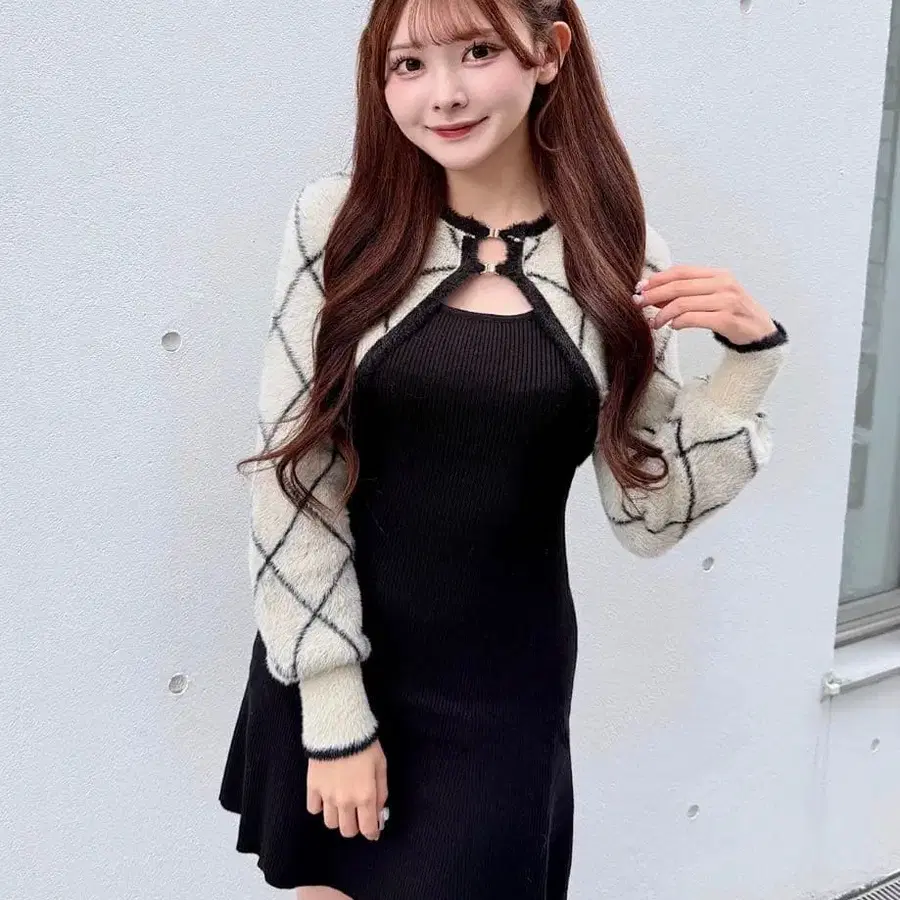 NOMAE 다이아 무늬 샤기 볼레로 니트 원피스