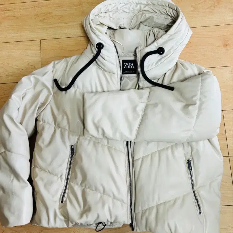 ZARA 후드 부착 다운 자켓 크림색