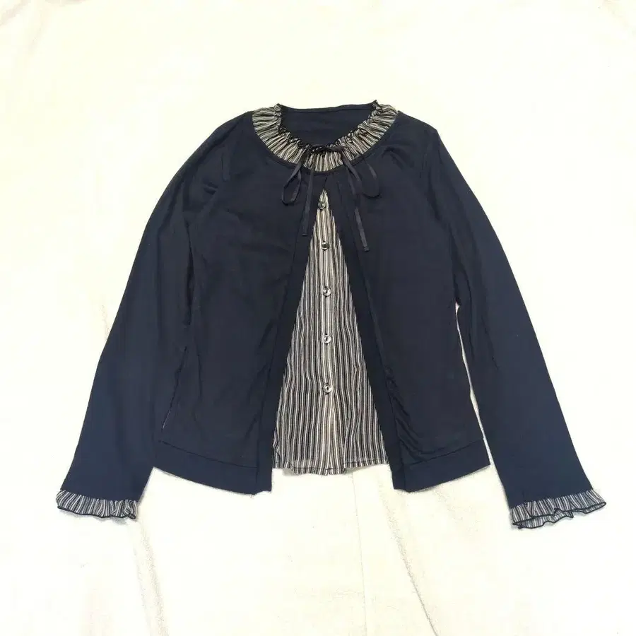 옷깃과 소매에는 프릴 개더가 더해져 여성스러운 엘레강트한 분위기를 연출합니다. 프론트의 리본 여밈과 버튼이 달린 스트라이프 패턴 부분이 악센트가 되어줍니다.