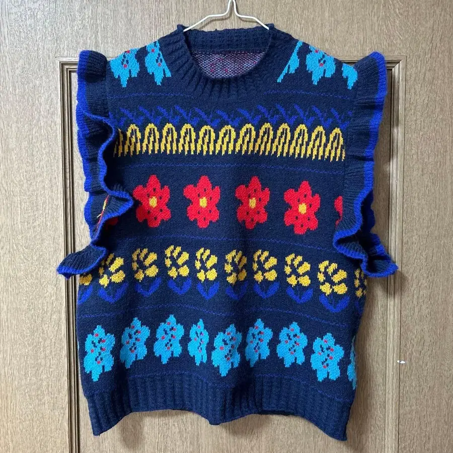 플라워 무늬 프릴 니트 베스트 네이비