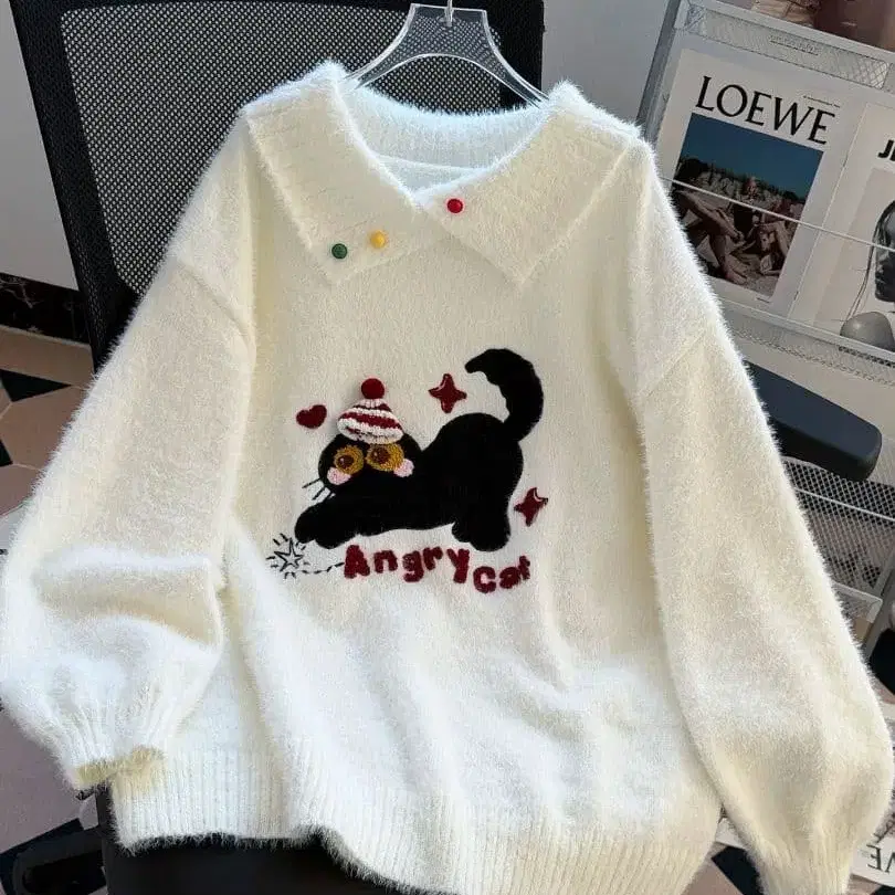 Angry Cat 자수 니트 스웨터 화이트