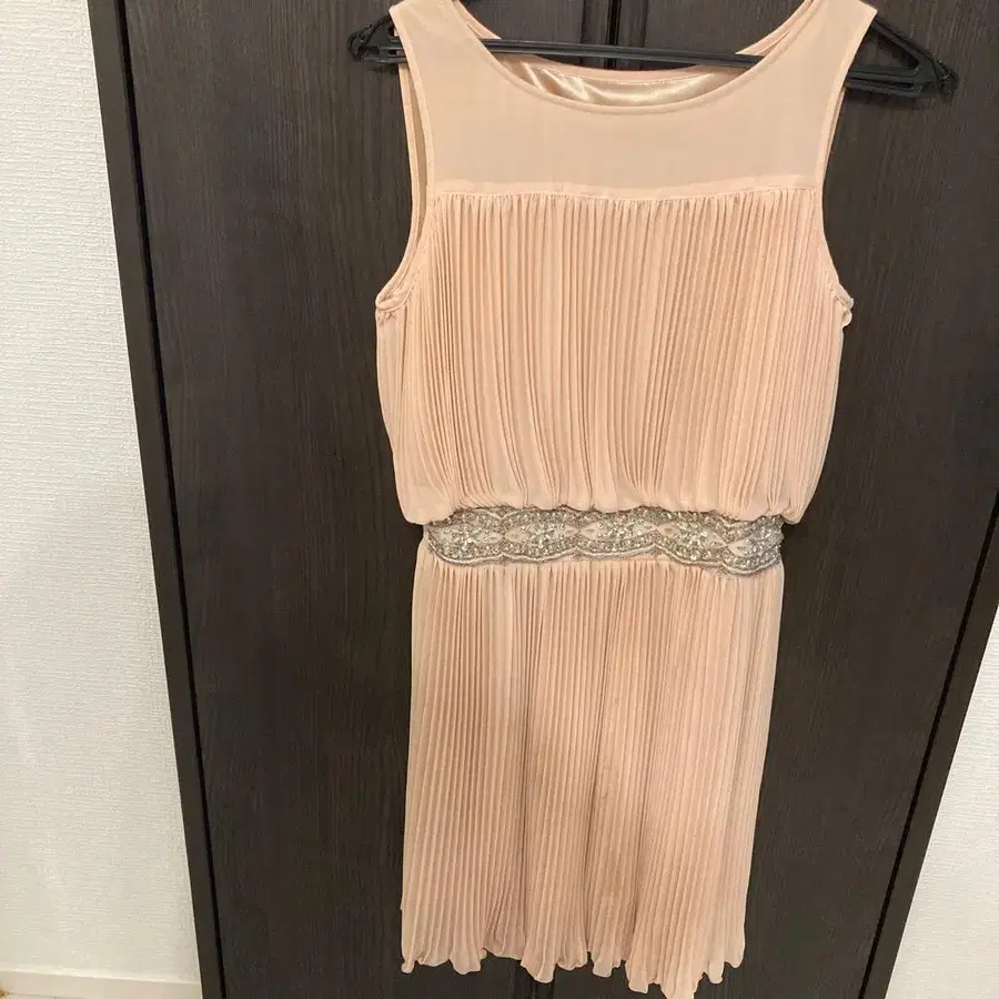 베이지 플리츠 슬리브리스 원피스