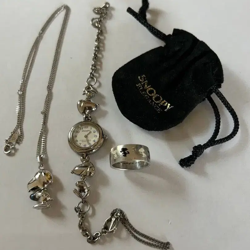 스누피 애니멀 모티브 시계와 반지, 펜던트의 실버 3종 세트