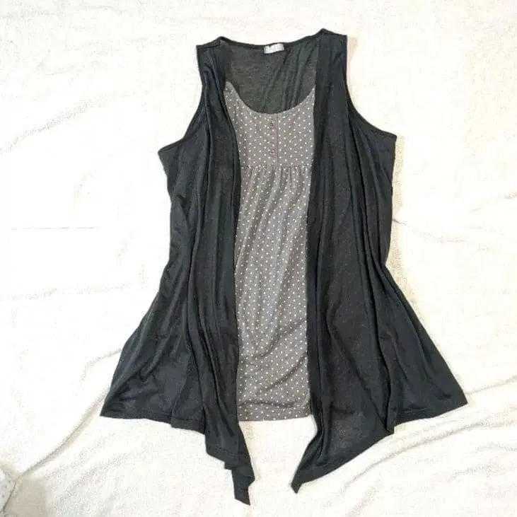 그레이 색상의 도트 무늬 이너에, 그레이 색상의 슬리브리스 롱베스트를 레이어드한 듯한 디자인입니다.