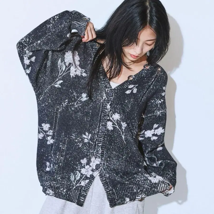 블러 플라워 프린트 V넥 가디건 / 블랙