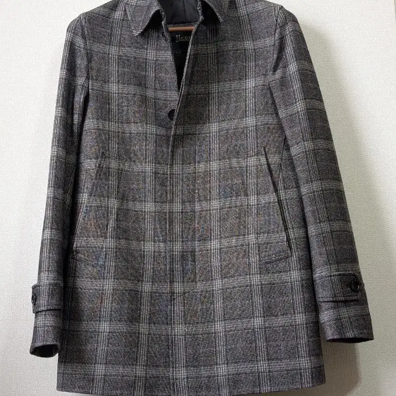 거의 새상품 Herno 체크 무늬 충전솜 스텐카라 코트 그레이