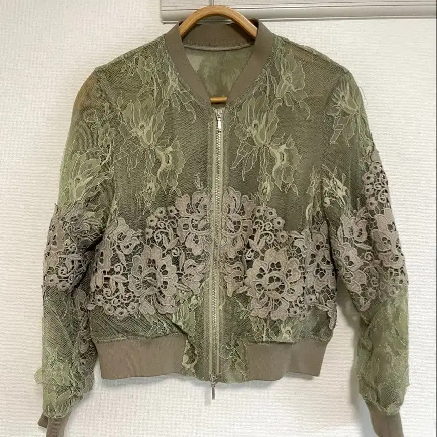 레이스 자수 봄버 자켓 올리브 그린