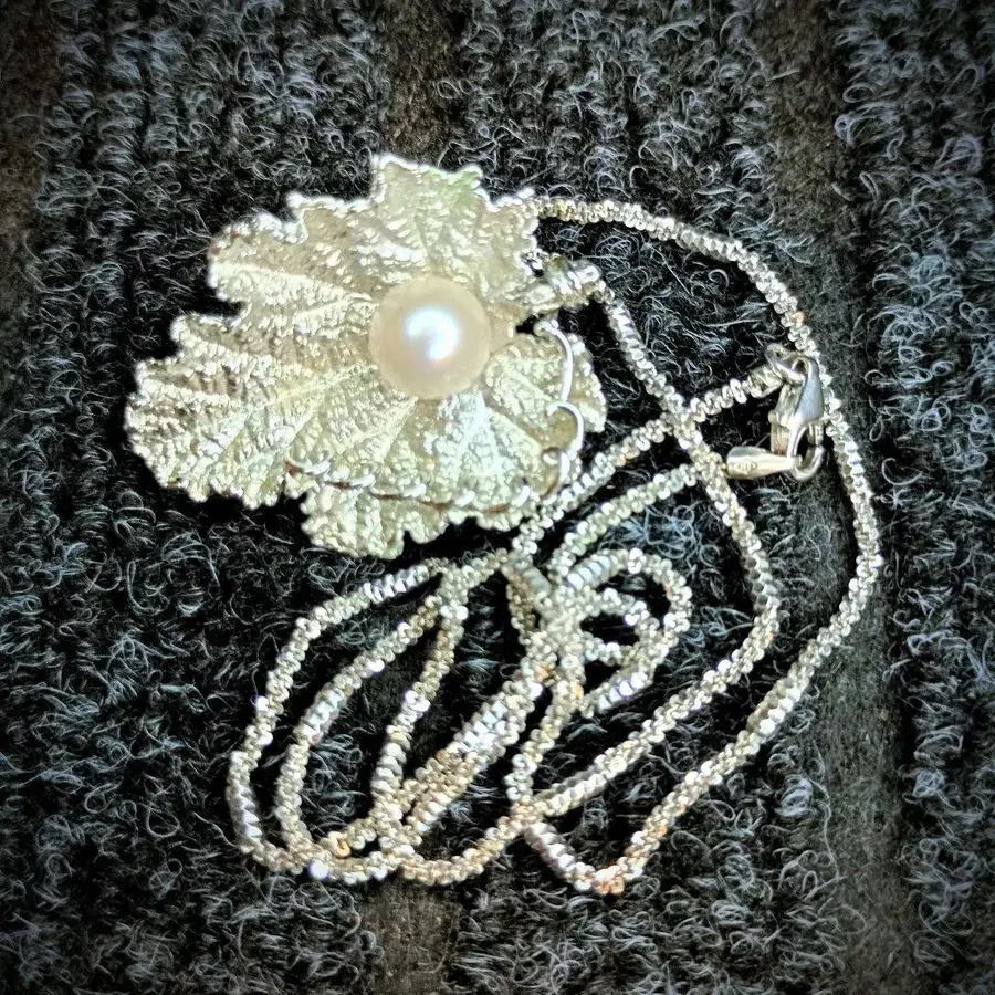 자동 번역되었어요. 원문보기리프 모티브 (잎의 오른쪽에 덩굴이 표현되어 있어 포도잎인가요?)에 펄이 장식된, 고급스러운 디자인의 목걸이 겸 브로치입니다.