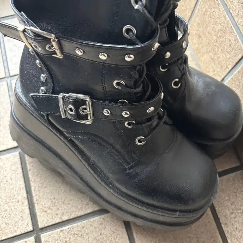 열람해 주셔서 감사합니다. 작년 여름에 한 번 착용한 후 한 번도 신지 않았습니다. 어디서 구매했는지 기억나지 않아 제조사는 불명입니다. 착용 사진은 3번째 사진을 참조해 주세요. 골격 스트레이트 체형인 제가 신어도 다리가 길어 보이고, 발목도 너무 조이지 않아 예뻐 보입니다. 평소 23.5~24.0cm를 착용하는데, 이 신발은 약간 여유가 있는 정도입니다. 스트랩과 스터드 디자인이 특징인 통굽 부츠 - 색상: 블랙 - 디자인: 스트랩 부착, 스터드 장식 - 소재: 합성 피혁 - 밑창 모양: 통굽 - 지퍼: 사이드 지퍼 부착 - 힐 높이: 높이 8cm, 발꿈치 부분은 10cm 정도 됩니다. 개인이 측정한 치수이므로 약간의 오차는 이해해 주세요. 즉시 구매 ⭕️ 사이즈 - 24cm