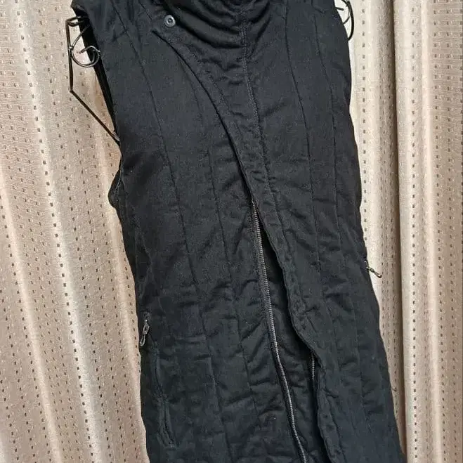 퀼팅 소재의 블랙 노카라 베스트, 지퍼 포켓 부착으로 기능적입니다.