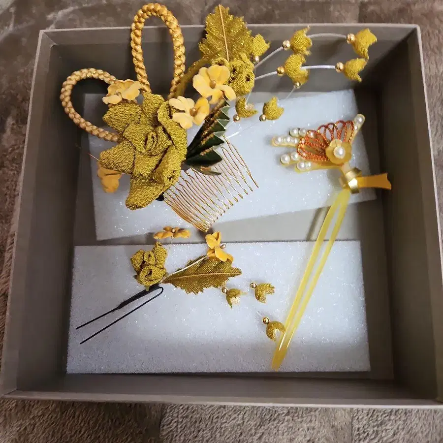 일본 의류 머리 장식 세트 옐로우 그린 꽃 모티브