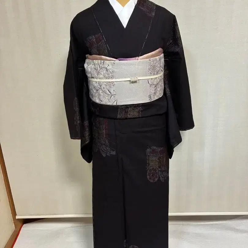 유키쓰무기 바탕의 고쇼구루마 패턴 코몬 이중 기모노