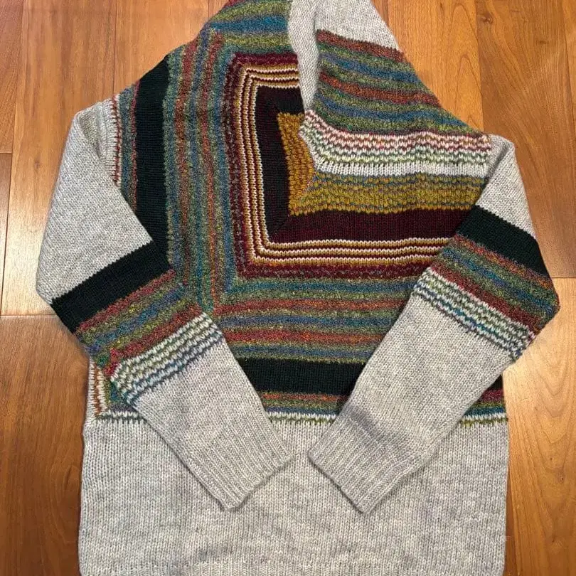 [미사용] 플레어 후드풍 디자인 니트 풀오버 그레이 바탕에 멀티 컬러