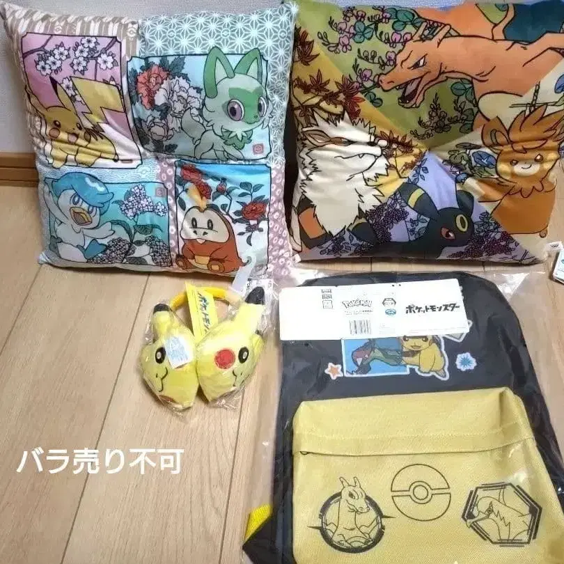 쿠션에는 다양한 포켓몬이 디자인되어 있으며, 백팩에는 피카츄와 카비곤이 그려져 있습니다.