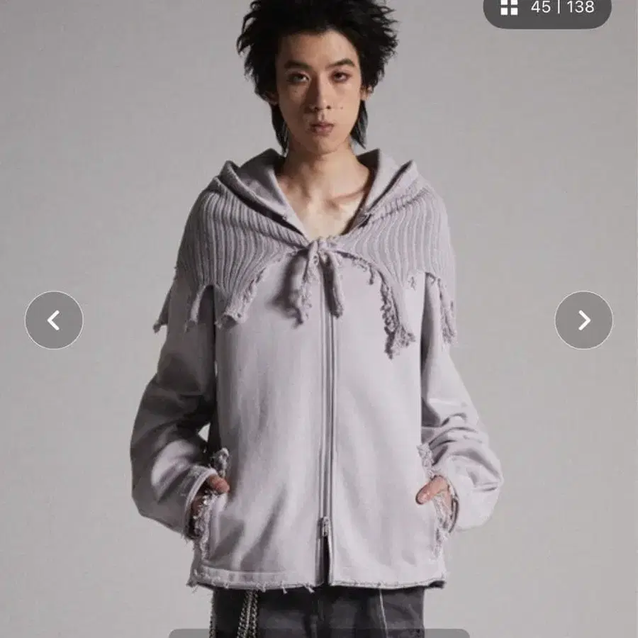 방문해 주셔서 감사합니다. 이 제품은 완판된 사이즈입니다. 2, 3회 착용한 제품입니다. - 색상: 그레이 - 사이즈: S 디자인 실루엣 이종 소재 절개와 단처리, 데미지 가공을 조합하여 GRANCY만의 엣지가 돋보이는 집업 후디입니다. 후드와 포켓 입구에는 단처리 니트 짜임을 사용하여 독보적인 존재감을 연출합니다. 소매와 밑단도 단처리 사양으로 하여, 착용을 거듭할수록 생기는 질감의 변화를 즐길 수 있는 마감입니다. 몸통의 슬래시 포켓은 단처리 부분을 돋보이게 하며, 앞뒤 기장 차이가 모던한 느낌을 더합니다. YKK 더블 지퍼를 채용하여 코디에 자유로운 어레인지를 더할 수 있는 아이템입니다. ◆ 소재 본체에는 헤비 웨이트 쭈리 (490g)를 채용했습니다. 탄탄한 두께감으로 인한 견고함과 아름다운 실루엣, 부드러운 촉감을 겸비하고 있습니다. 후드 끝과 포켓 입구에 절개한 니트 부분에는 굵은 면사를 사용했습니다. 내추럴한 질감과 부드러움을 가지며, 쭈리 소재와의 대비로 독자적인 존재감을 발산합니다.