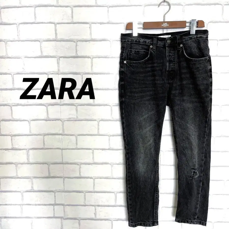 블랙 데님 특유의 깔끔한 분위기에 적당한 데미지 가공이 돋보이는 ZARA의 데님 팬츠.