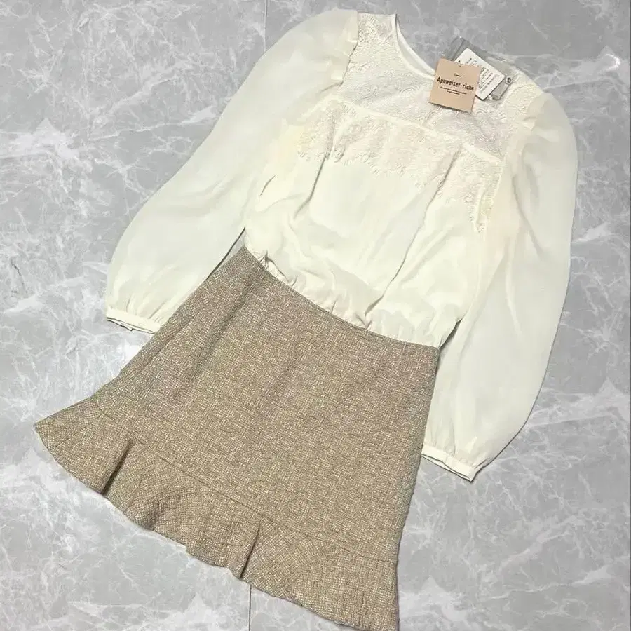 Apuweiser-riche(아푸와이저 리셰)의 블라우스 x 트위드 스커트가 일체화된 도킹 원피스입니다.