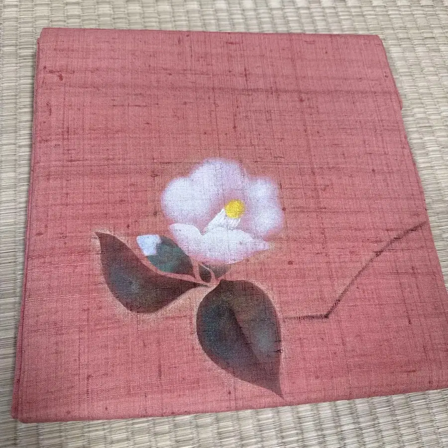 자동 번역되었어요. 원문보기동백꽃 무늬가 들어간 핑크색 명주 나고야 오비입니다. 실크 소재로 고급스러운 마감입니다.